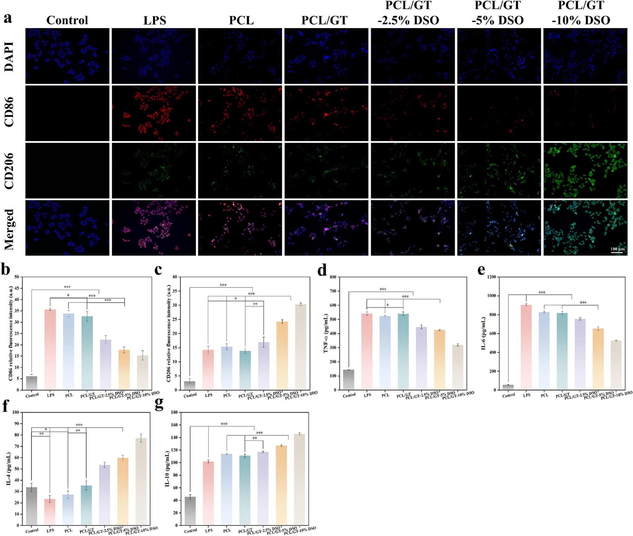 抗氧化活性方面,负载10%杜氏盐藻油脂的聚己内酯/明胶纳米纤维组对DPPH/ABTS自由基清除率大于98%。在H2O2或脂多糖诱导的小鼠腹腔巨噬细胞模型中,盐藻油脂纤维显著降低胞内ROS水平,提高细胞存活率。免疫荧光显示盐藻油脂纤维促使巨噬细胞由促炎表型M1向抑炎表型M2极化,酶联免疫测试证实该纤维可显著下调细胞促炎因子TNF-α、IL-6分泌水平,上调抗炎因子IL-4、IL-10促炎因子。本研究构建的负载杜氏盐藻油脂的聚己内酯/明胶静电纺丝纳米纤维敷料通过清除ROS、调节巨噬细胞极化和炎症因子,有效改善伤口微环境,在创面修复领域具有广阔应用前景。