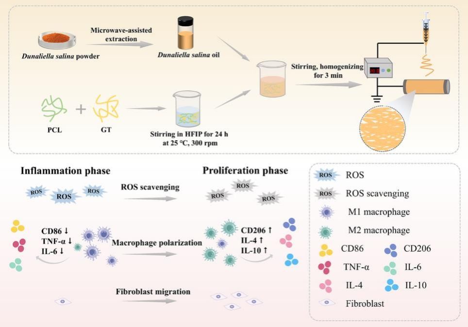 近期,新疆师范大学化学化工学院王英波教授、白希高级实验师联合在创面敷料研究领域取得重要进展。团队利用静电纺丝技术成功将杜氏盐藻油脂负载于聚己内酯/明胶纳米纤维中,开发出一种兼具抗氧化、抗炎及促愈合功能的多功能敷料。相关成果以“Multifunctional electrospun nanofiber mats based on polycaprolactone/gelatin incorporated with Dunaliella salina oil for potential antioxidant activity, anti-inflammatory activity and wound healing applications”为题发表于爱思唯尔数据库期刊《International Journal of Biological Macromolecules》(中科院二区TOP,IF=8.5)。硕士研究生张丽娟为第一作者,王英波教授、白希高级实验师为通讯作者。该工作获得新疆维吾尔自治区自然科学基金面上项目(2025D01A51)的资助。