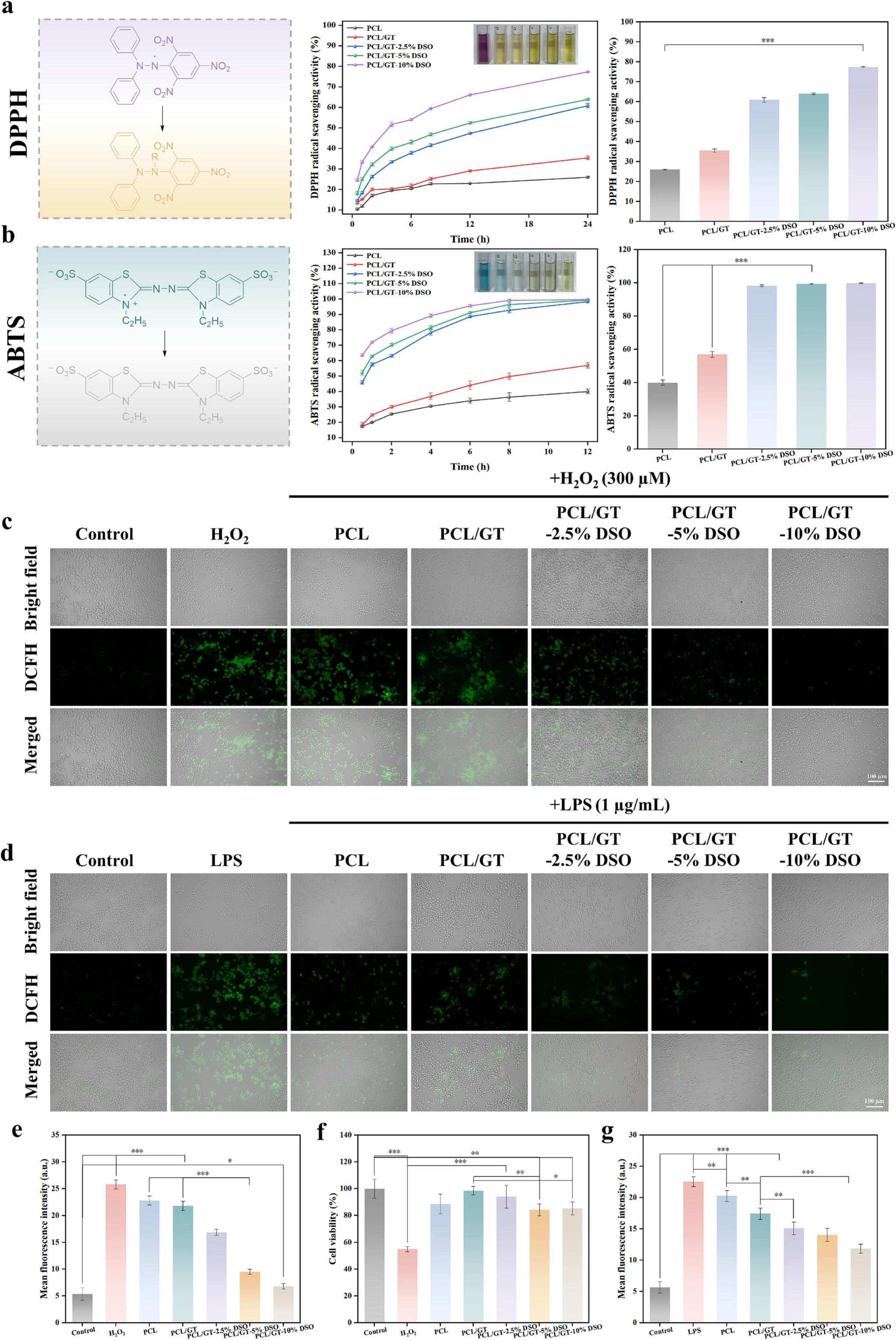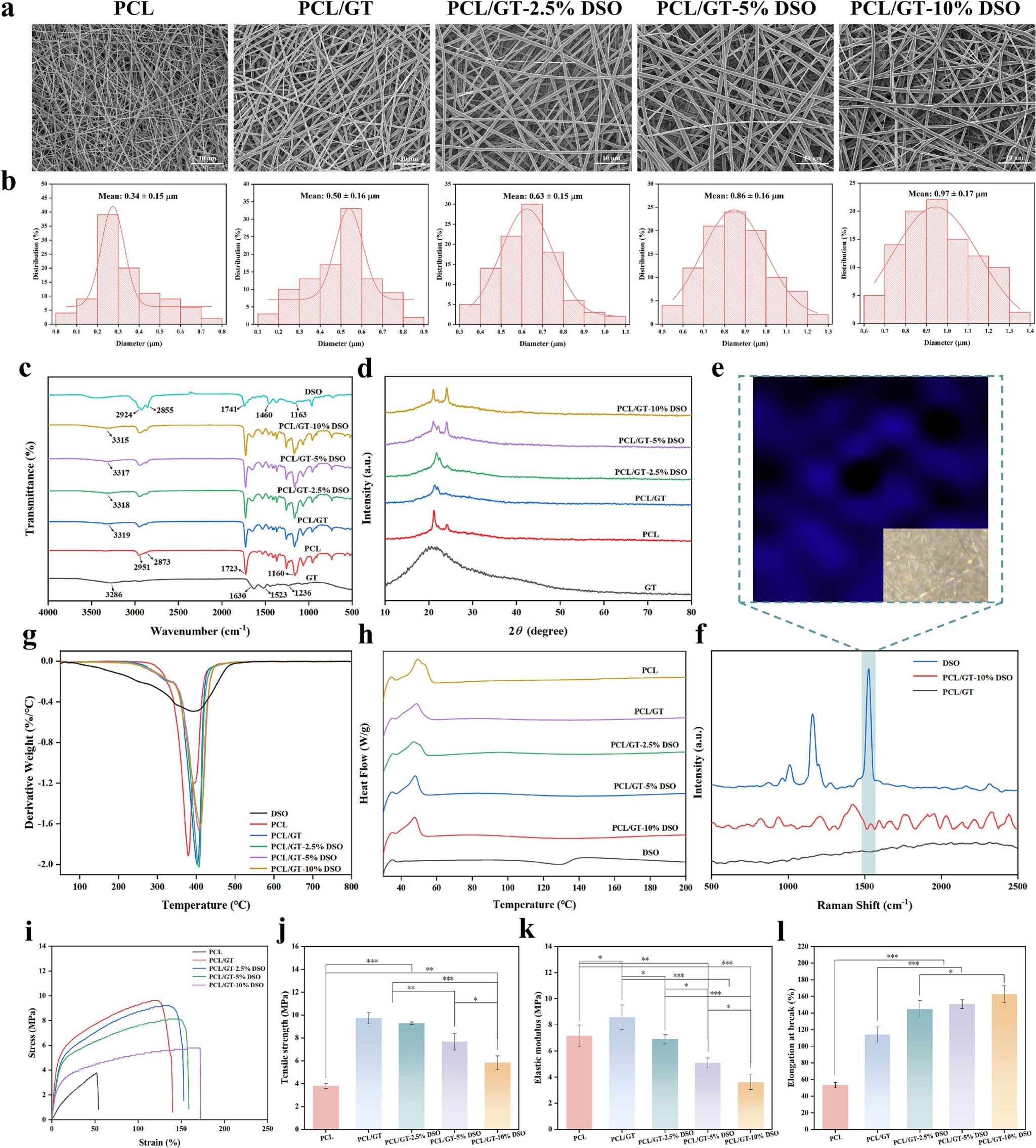 该工作通过静电纺丝将盐藻油脂包封于聚己内酯/明胶纳米纤维中,实现长效保护与释放。该纤维平均直径0.34–0.97 μm,可模拟细胞外基质结构。热分解温度达410 °C,拉伸强度最高为5.85 MPa,断裂伸长率162.67%。孔隙率>70%,水蒸气透过率3684–4051 g·m−2·d−1,接触角在63°–121°之间,24 h吸水率>170%,可持续释放盐藻油脂达30天,累计释放率>70%,遵循非Fickian扩散。CCK-8显示细胞存活率>80%,活死染色几乎无死细胞,溶血率<5%。细胞划痕实验表明负载10%杜氏盐藻油脂的聚己内酯/明胶纳米纤维组24h细胞迁移率达51.7%,显著高于对照组(33.8%)。