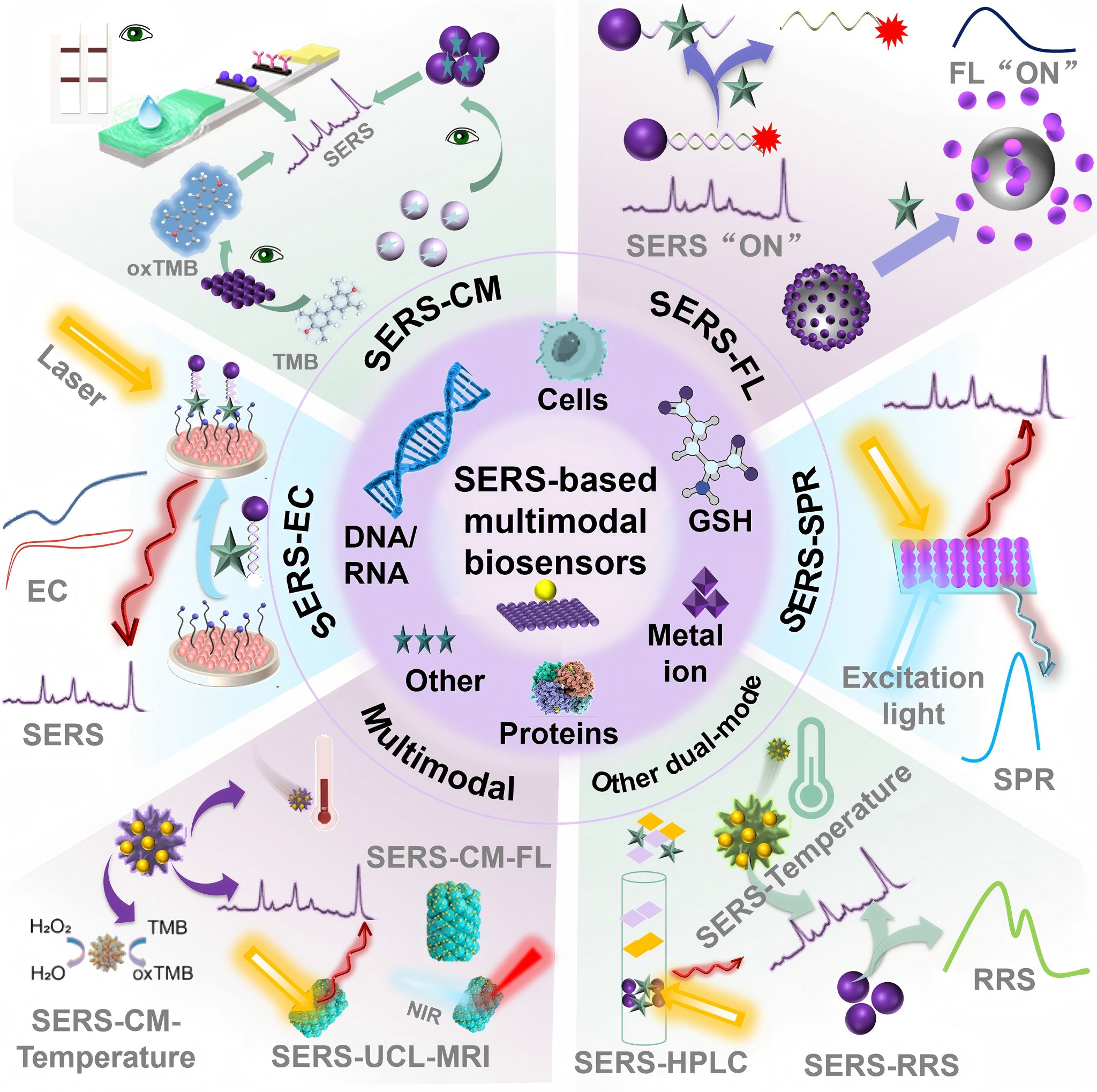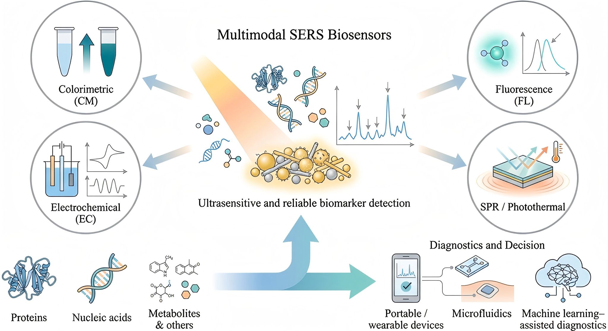 生物标志物(Biomarkers)在疾病诊断、分期、预后评估与疗效监测中具有重要意义,但许多临床相关标志物在复杂生物基质中含量极低,传统ELISA、免疫荧光和PCR等方法往往存在流程耗时、仪器依赖强或多重检测能力受限等问题。表面增强拉曼散射(SERS)因其分子指纹识别能力与超高灵敏度受到关注,但单一SERS模式在真实样本中仍可能面临信号波动、基质干扰与定量稳健性不足等挑战。因此,将SERS与比色、荧光、电化学等互补读出通道进行融合的“多模态SERS”策略,正成为提升检测可靠性与信息维度的重要方向。