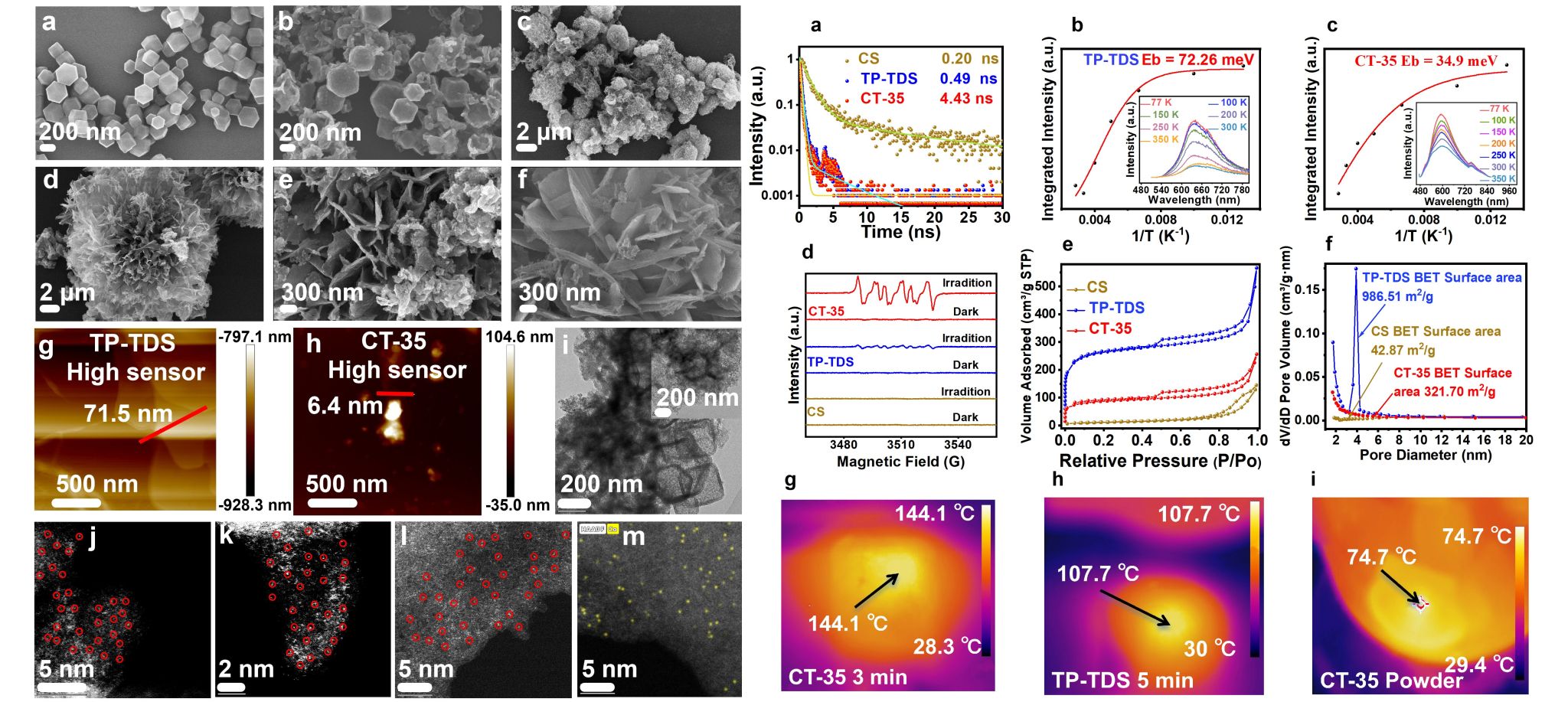 形貌和结构表征显示,CT-35异质结构在Co-N/O配位作用下,由原本的COF三维网络和CS“肺泡”自发重组为高度有序的万寿菊状超结构,层板厚度显著减薄(约6.4 nm),形成紧密界面,同时单原子Co位点均匀分散于整体框架中,无聚集现象,实现了原子级分散与纳米限域协同的光催化结构。载流子动力学和结构分析表明,CT-35异质结构通过Co-N/O桥键显著延长电子寿命并降低激子结合能,促进自由电子生成并迁移至催化表面,同时空心CS柱撑效应增加层间距,优化孔径分布以利于传质。光照下的光热效应进一步加速表面反应,而非独立驱动析氢,从而实现高效光催化性能。
