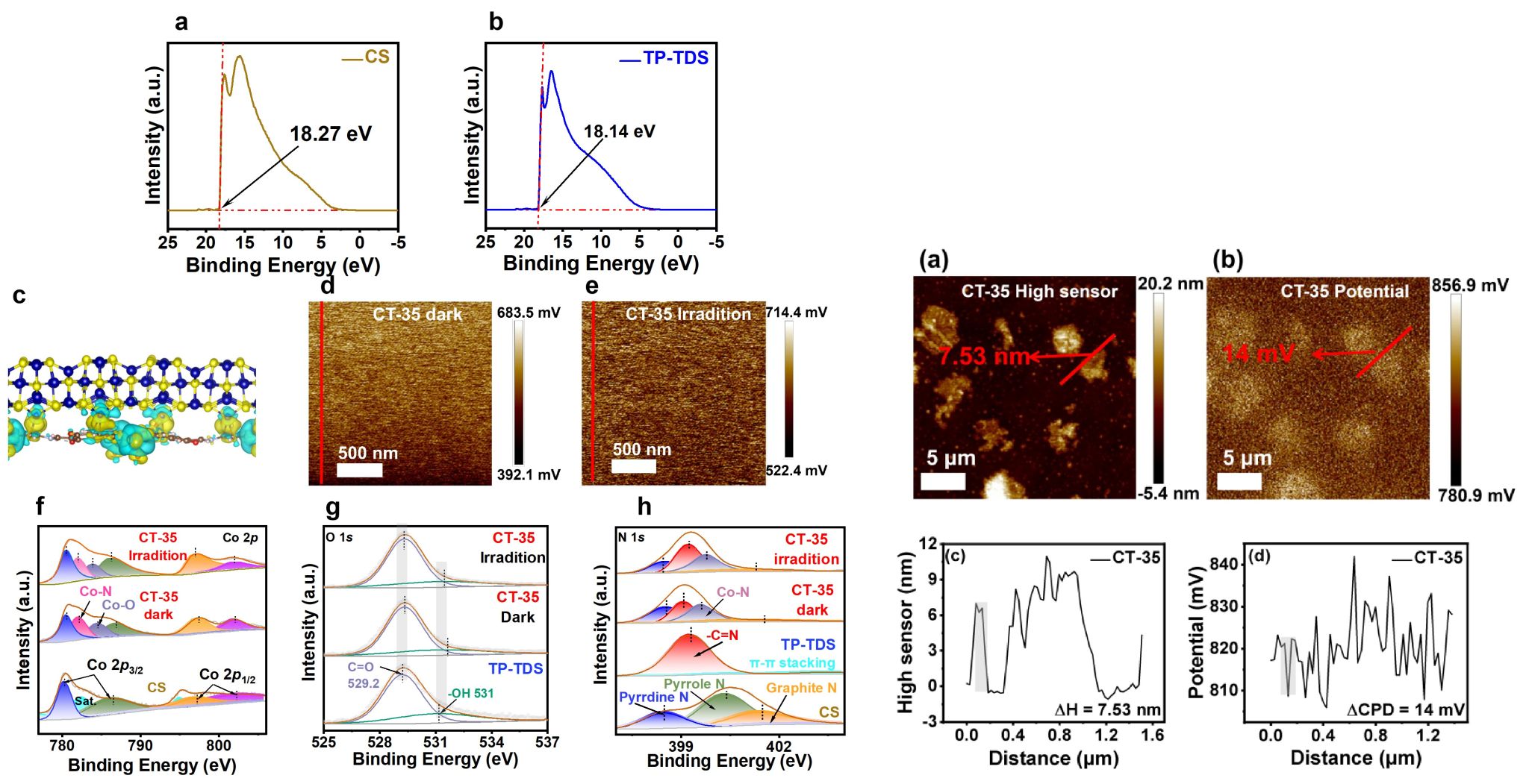 多尺度电场表征表明,CT-x异质结构中,CS与TP-TDS通过Co-N/O键接触后形成界面内建电场,驱动电子从TP-TDS向CS定向迁移。UPS、DFT、电势测量(KPFM)及原位XPS结果从宏观到原子尺度一致揭示了电场存在、强度及光照下电子的定向流动,为光生电子高效输送至催化位点提供了明确证据。