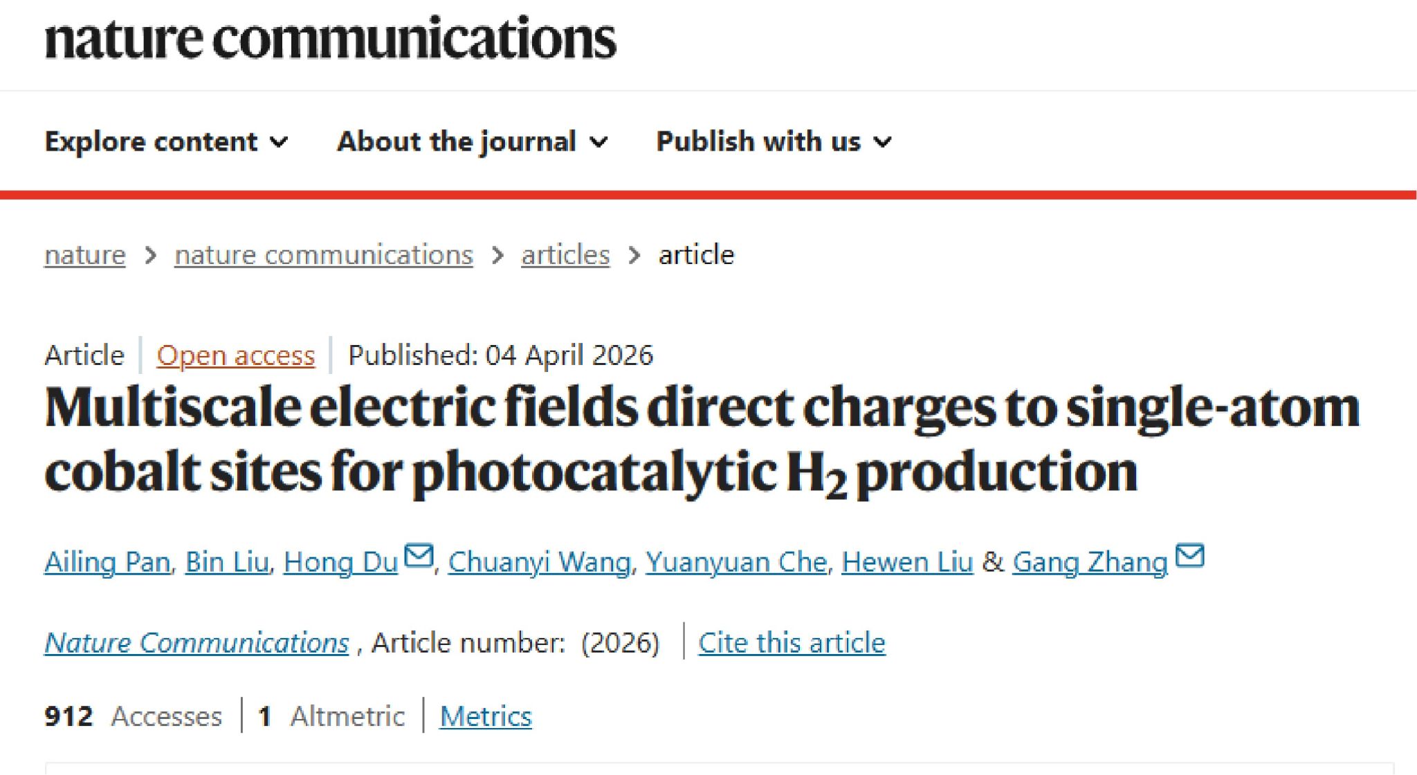 近日,我校化学化工学院杜虹教授团队在学术期刊《Nature Communications》在线发表了题为“Multiscale electric fields direct charges to single-atom cobalt sites for photocatalytic H2 production”的学术论文。