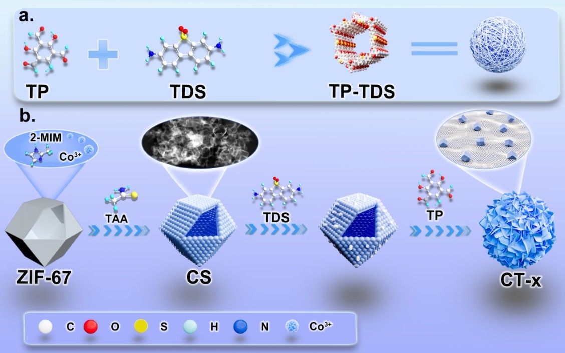 图2展示了CT-x异质结构的两步配位导向自组装过程。第一步,将ZIF-67前驱体经溶剂热硫化转化为空心Co₃S₄“CS肺泡”,其表面富含不饱和Co位点,并与TDS配体(3,7-二氨基二苯并噻吩-5,5-二氧化物)上的氨基形成Co-N配位,生成CS-NH2中间体。第二步,在CS-NH2存在下加入TP单体(2,4,6-三甲酰基间苯三酚),TDS上的预锚定氨基与TP的醛基发生席夫碱缩合,原位构建TP-TDS COF。该图清晰地展示了从ZIF-67到最终仿生结构的完整演化路径,突出了“一锅法”实现多级结构控制的化学创新。
