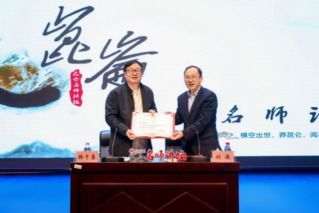 讲座开始前,刘俊代表学校向韩子勇研究员颁发新疆师范大学文化润疆研究院学术委员会主任委员聘书。
