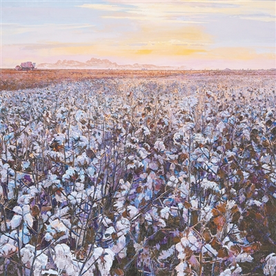 如果说改革开放初期的新疆油画,多聚焦于草原牧歌、巴扎风情等静态抒写,那么当下创作则将视角转向动态发展,让活力新疆日日新的蓬勃气象跃然于画布之上。付剑锋深耕工业题材四十载,在其《逆光——国之重器系列组画之六十六》等作品中,独山子的石油管道在光影交织中化作钢铁脊梁,石油工人的身影与机械齿轮构成“人与时代共生”的视觉史诗。马勇《新疆棉——沃野》(见图)更是以淋漓尽致的笔触,让机械化采棉的金色轨迹与天山雪峰形成冷暖对话,棉田如云海般翻滚,既是对“白色黄金”产业的礼赞,也是对科技赋能新疆农业的生动诠释。这些作品不再是对现实场景的简单复刻,而是将经济社会发展成就转化为可触摸的美学符号,让观众在形色的视觉冲击中感知新疆大地的历史变迁。