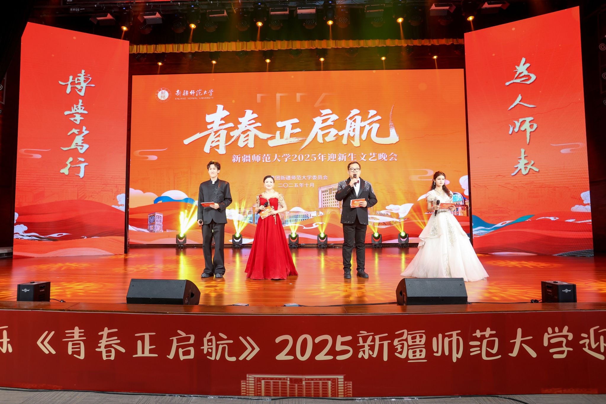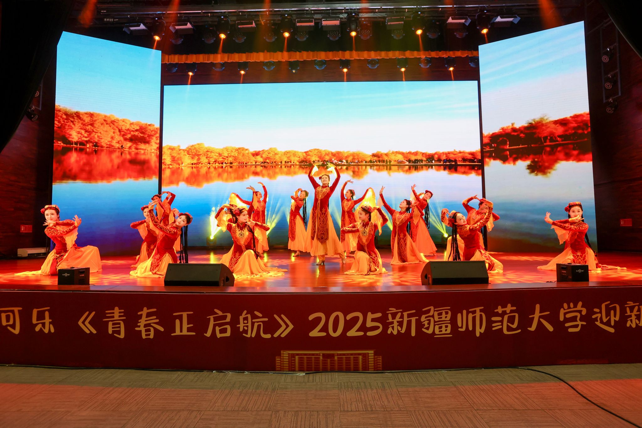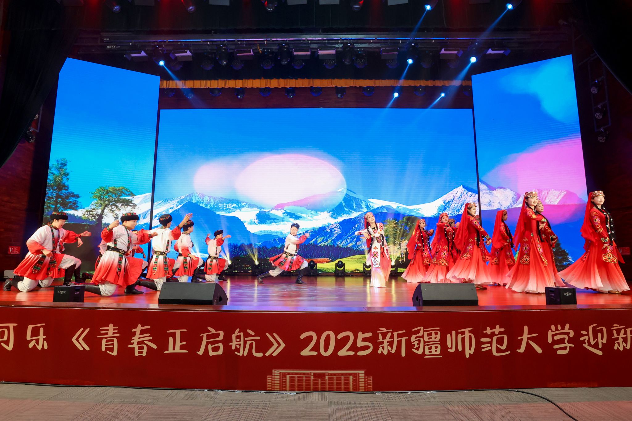 晚会在开场舞《晨曦中的玫瑰》中拉开序幕,优美的舞姿与动人的旋律瞬间点燃全场气氛。第一篇章以“新疆故事”为主线,特别设置了“新疆维吾尔自治区成立70周年主题成就展讲解员讲述新疆故事”环节,展现了新疆的壮美山河与发展成就。《和谐新疆》与《帕米尔之情》,用歌声与乐器传递出民族团结的深情厚谊。第二篇章聚焦青年学子的朝气与梦想,歌曲《我的天空》唱出了青年一代的梦想与追求;舞蹈《black sheep》展现了力与美的结合;舞蹈《一条大河》与校园十佳歌手演唱的《世界赠予我的》则将青春的热情与深情完美融合,引发全场共鸣。第三篇章以“启航”为主题,激励新生勇敢追梦、不负韶华。舞蹈《Takiiii》节奏明快、充满张力;合唱《光亮》以温暖的声音照亮前路;《炫彩青春》健美操表演则用动感的舞步展现了青春的绚烂多彩。