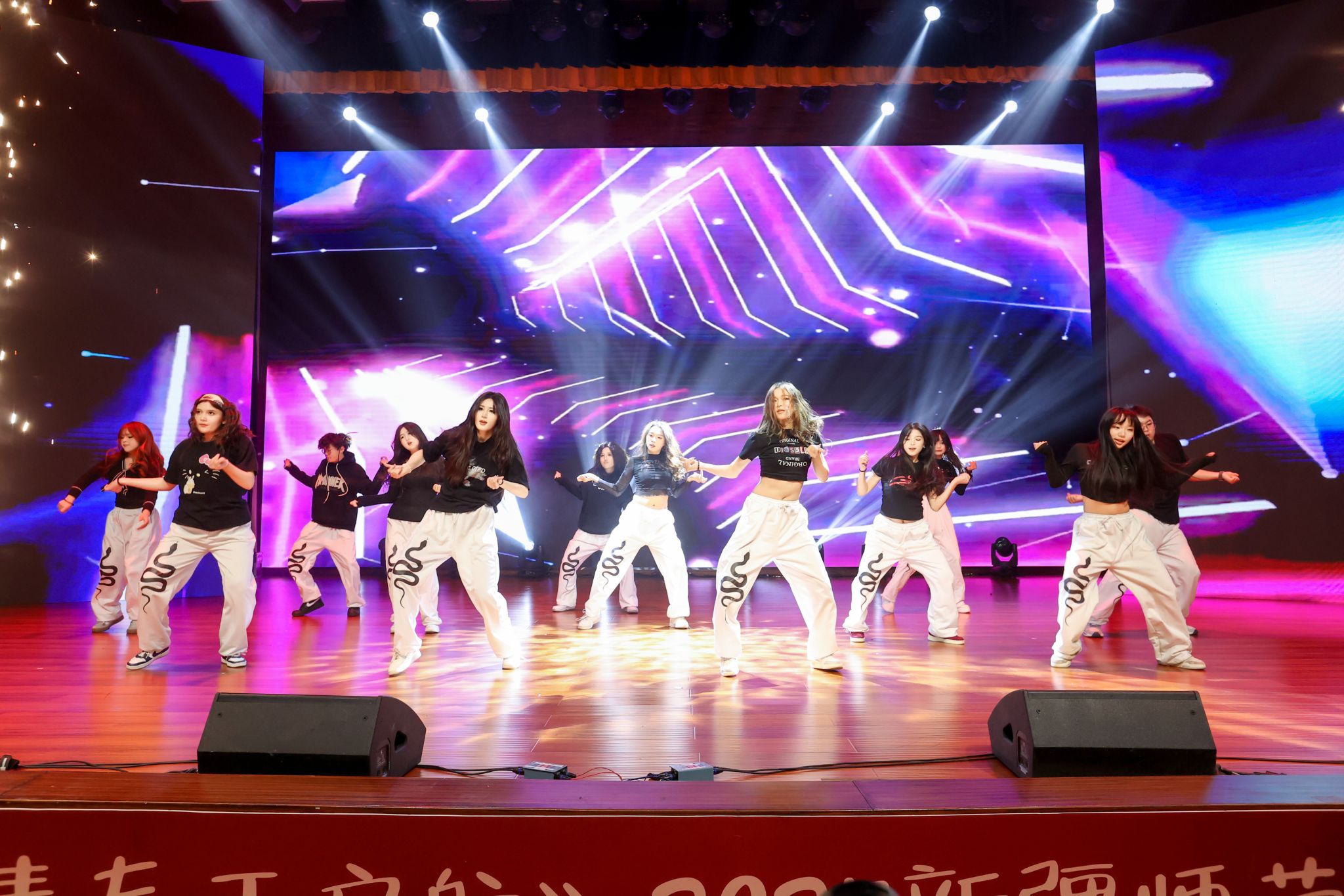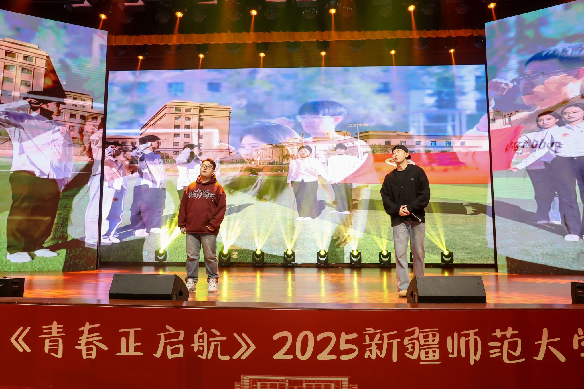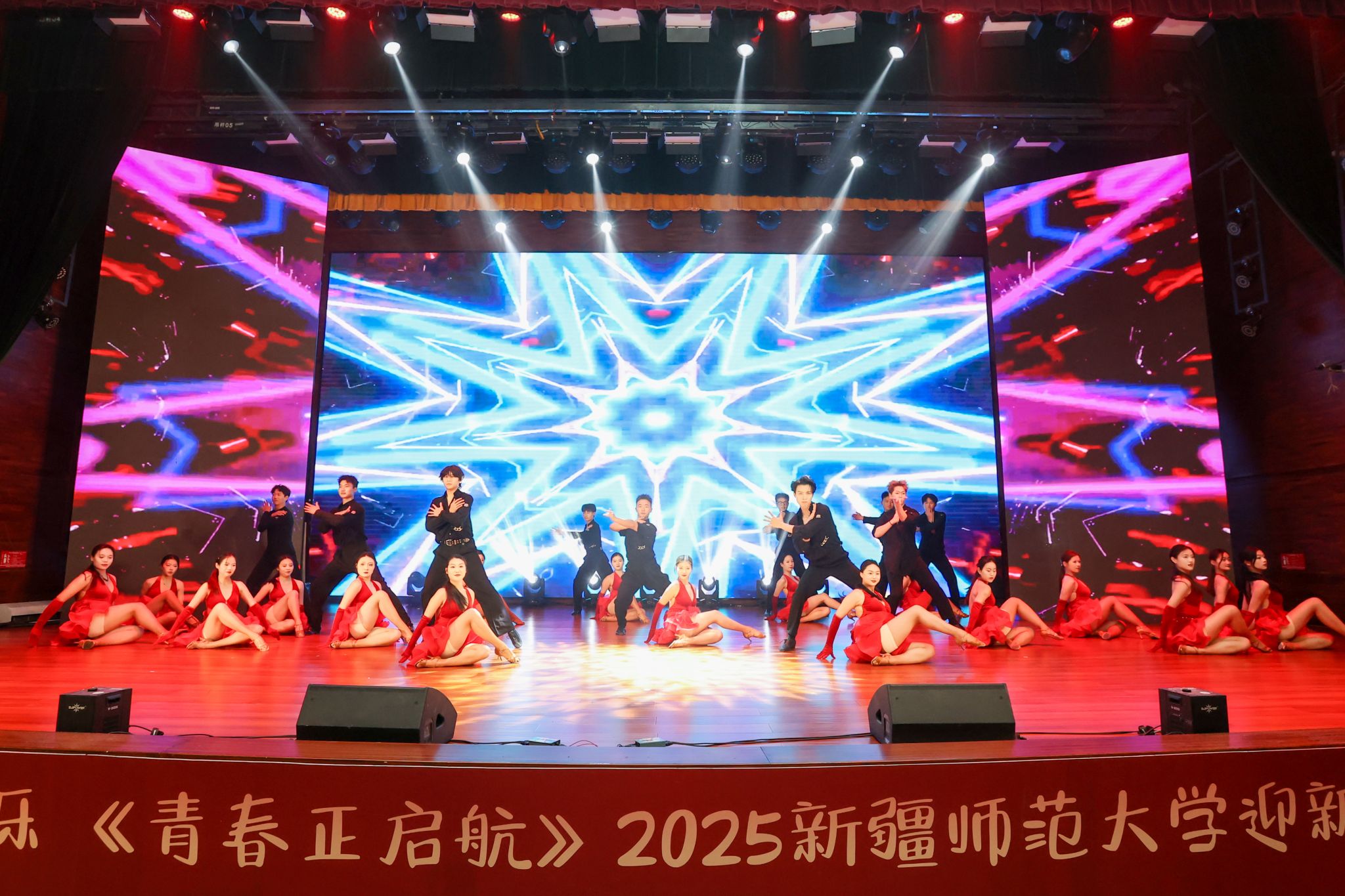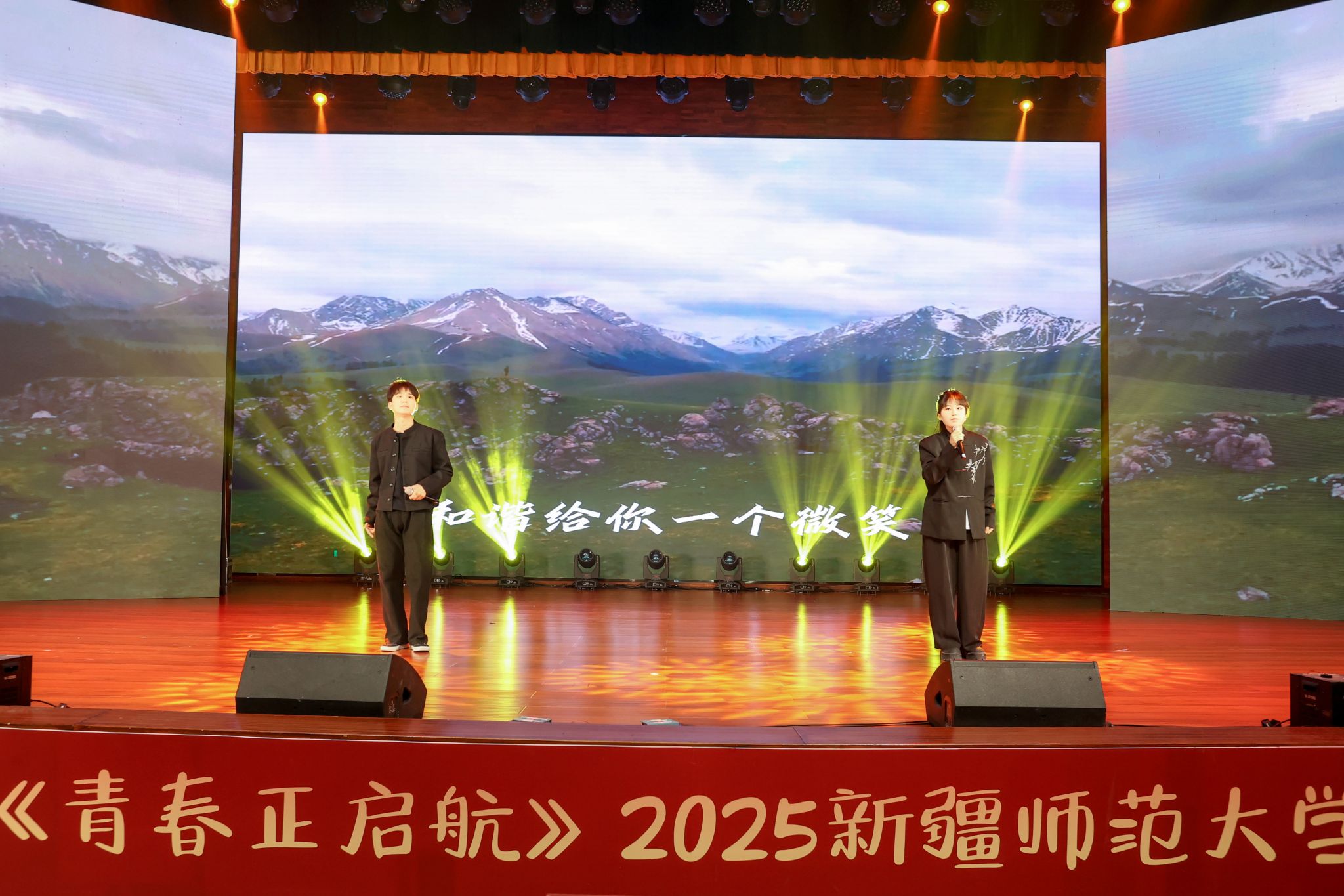 晚会在开场舞《晨曦中的玫瑰》中拉开序幕,优美的舞姿与动人的旋律瞬间点燃全场气氛。第一篇章以“新疆故事”为主线,特别设置了“新疆维吾尔自治区成立70周年主题成就展讲解员讲述新疆故事”环节,展现了新疆的壮美山河与发展成就。《和谐新疆》与《帕米尔之情》,用歌声与乐器传递出民族团结的深情厚谊。第二篇章聚焦青年学子的朝气与梦想,歌曲《我的天空》唱出了青年一代的梦想与追求;舞蹈《black sheep》展现了力与美的结合;舞蹈《一条大河》与校园十佳歌手演唱的《世界赠予我的》则将青春的热情与深情完美融合,引发全场共鸣。第三篇章以“启航”为主题,激励新生勇敢追梦、不负韶华。舞蹈《Takiiii》节奏明快、充满张力;合唱《光亮》以温暖的声音照亮前路;《炫彩青春》健美操表演则用动感的舞步展现了青春的绚烂多彩。