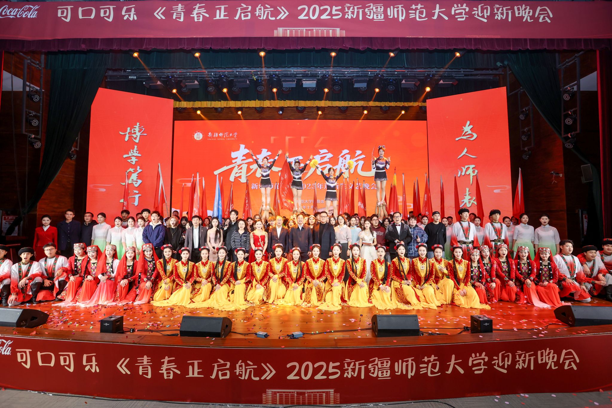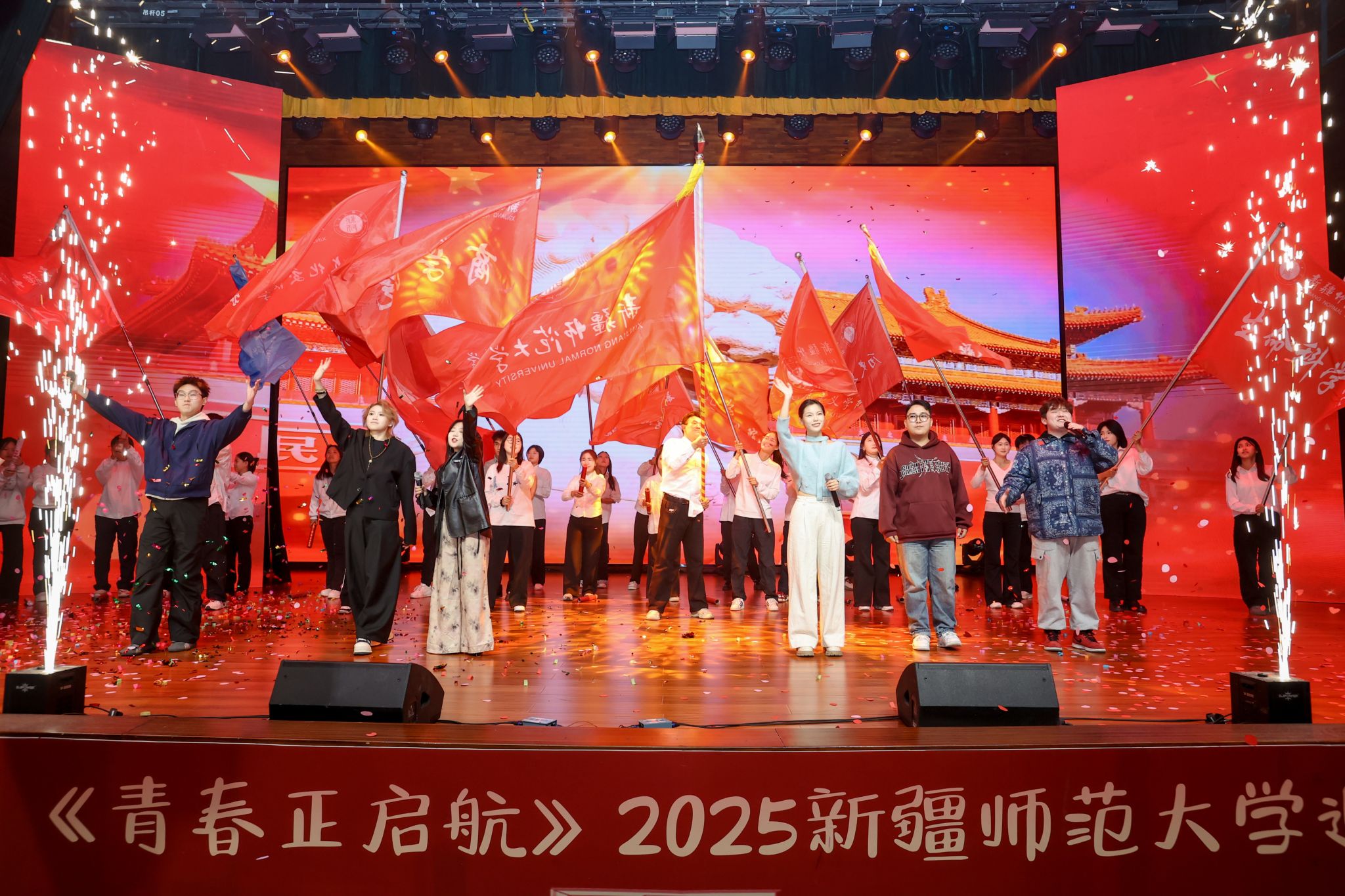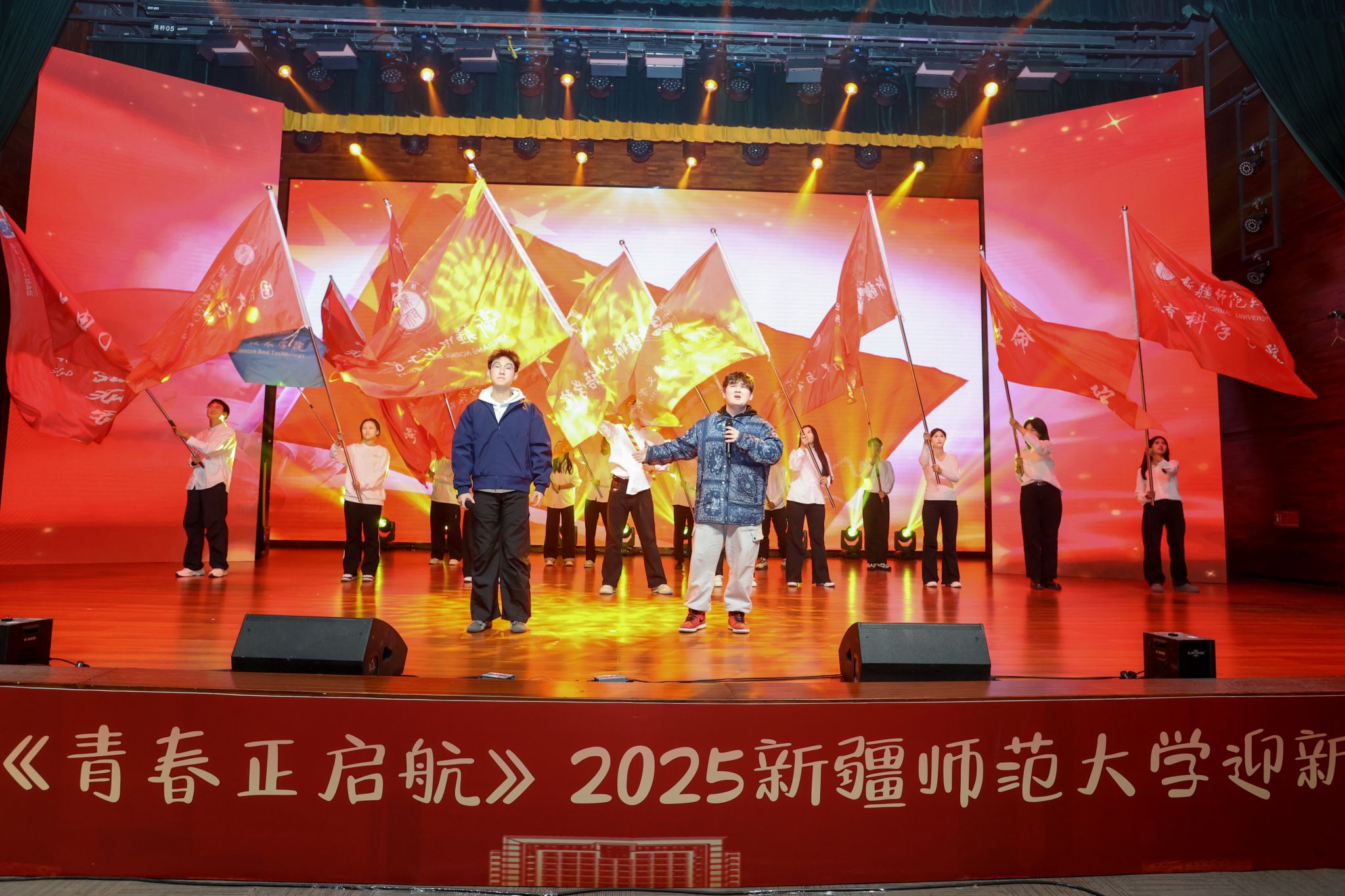 晚会在全体演员与观众齐声高唱《红旗飘飘》的激昂歌声中圆满落幕。红旗飘扬,歌声嘹亮,展现了新时代师大学子与祖国同行、与时代共进的坚定信念。