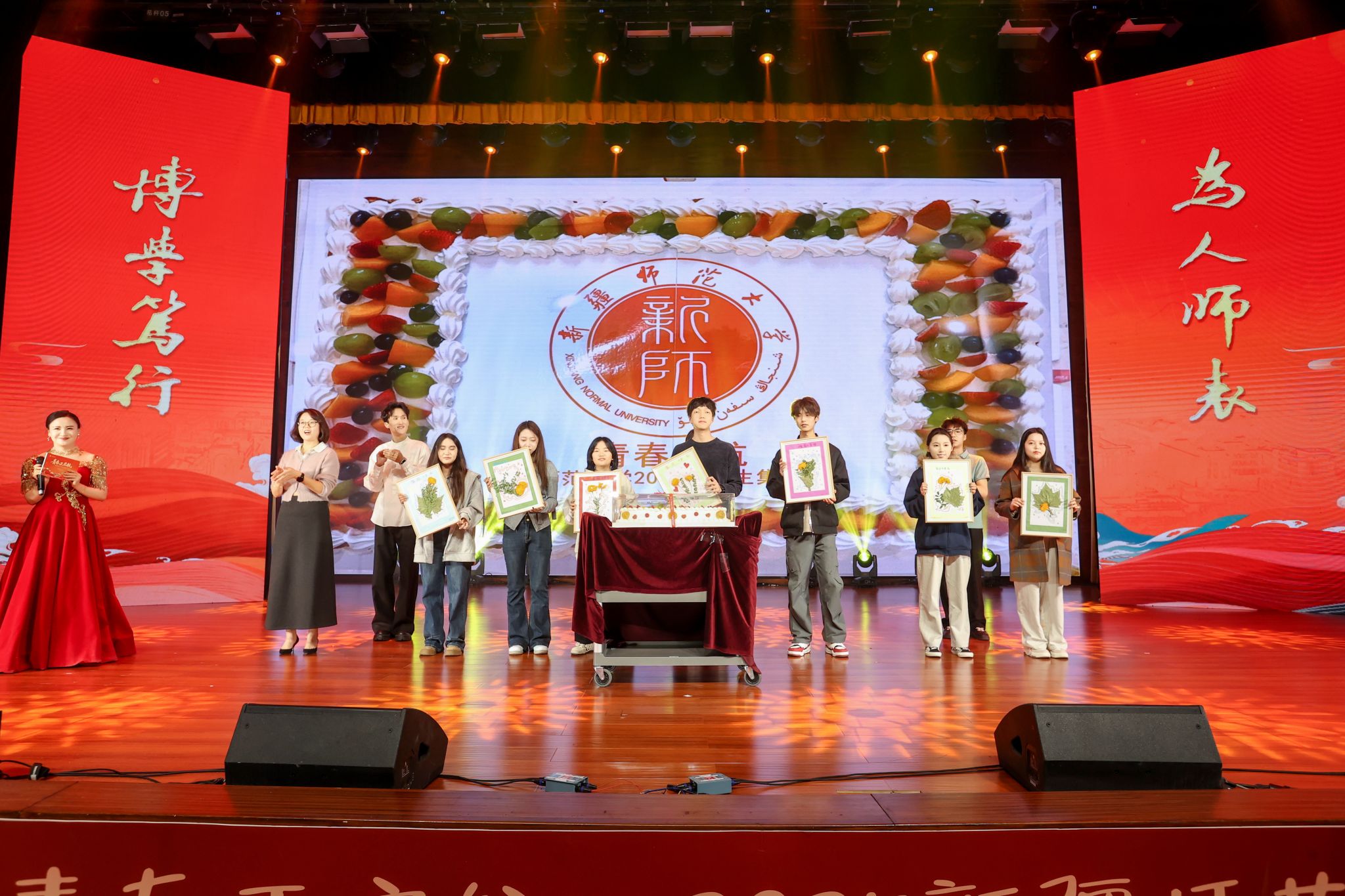 特别环节中,晚会为当天生日的新生送上了由我校对口帮扶的喀什地区莎车县亚喀艾日克乡中心小学学生亲手制作的礼物,温暖感人。志愿者代表、基层就业学生代表和研究生代表分别分享了他们的成长感悟,激励新生树立远大理想,服务社会、报效祖国。