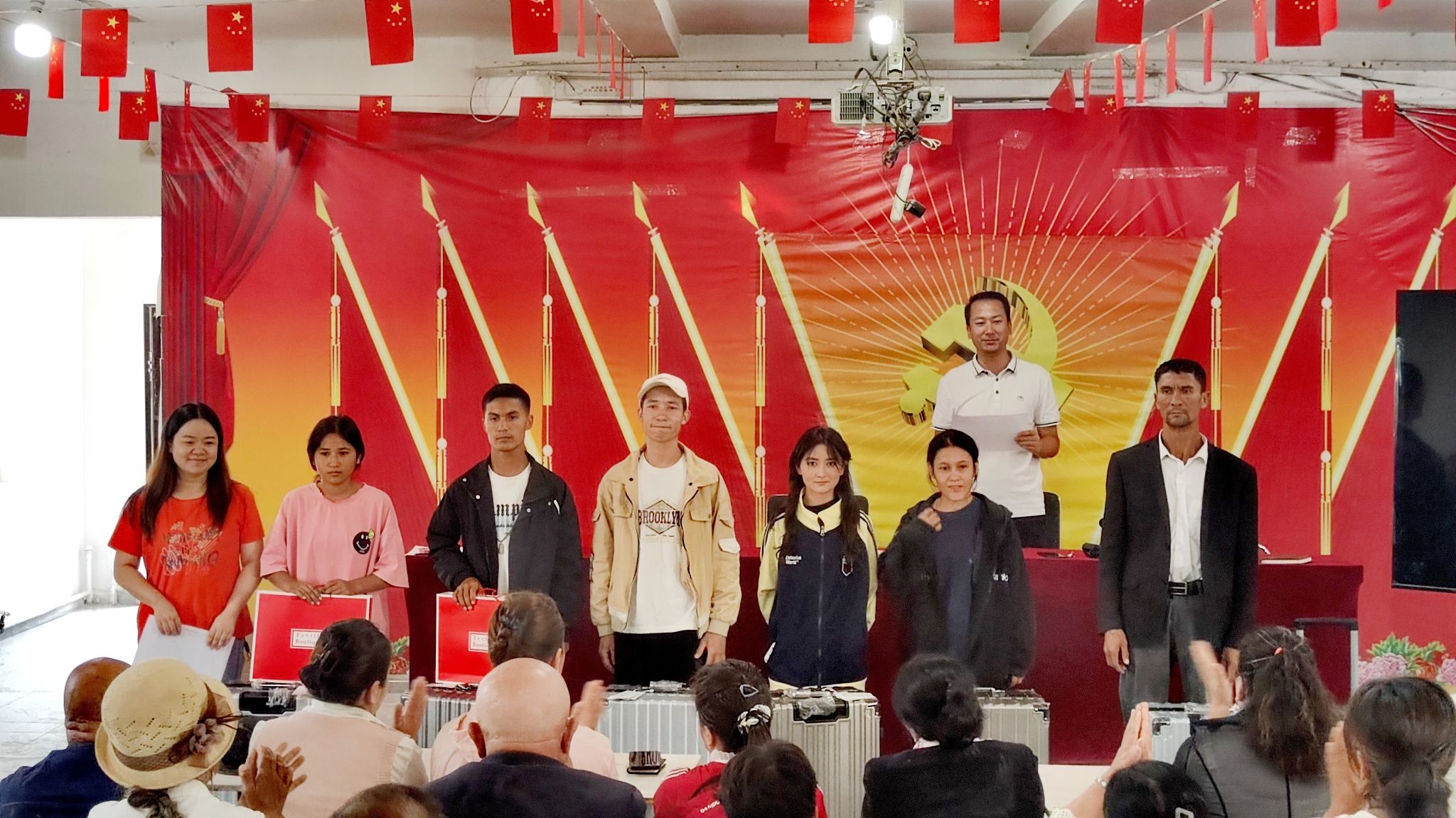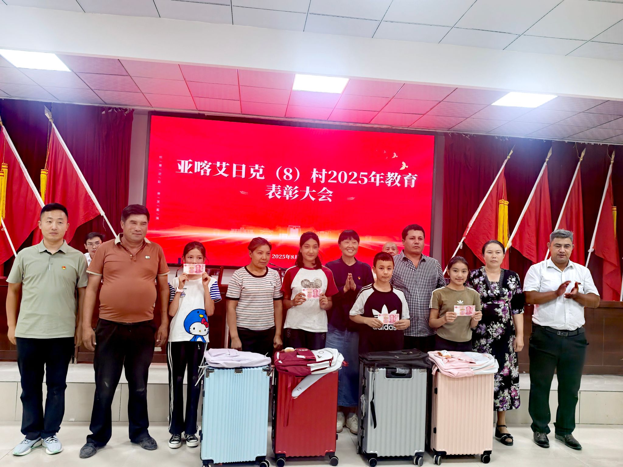 8月27日,亚喀艾日克乡亚喀艾日克(8)村工作队联合村“两委”举行教育表彰大会,对本村3名考取大学本科和4名考入内初班的学生进行了表彰奖励,给优秀学子发放了奖金以及精心准备的行李箱和书包。受表彰的学生代表发表了感言。我校驻莎车县前方党工委书记、(8)村工作队长李莉寄语受表彰学子志存高远、脚踏实地,在新的人生阶段取得更大进步。同时希望家长们能一如既往地关心、关注孩子们的健康成长,继续为他们的发展保驾护航。